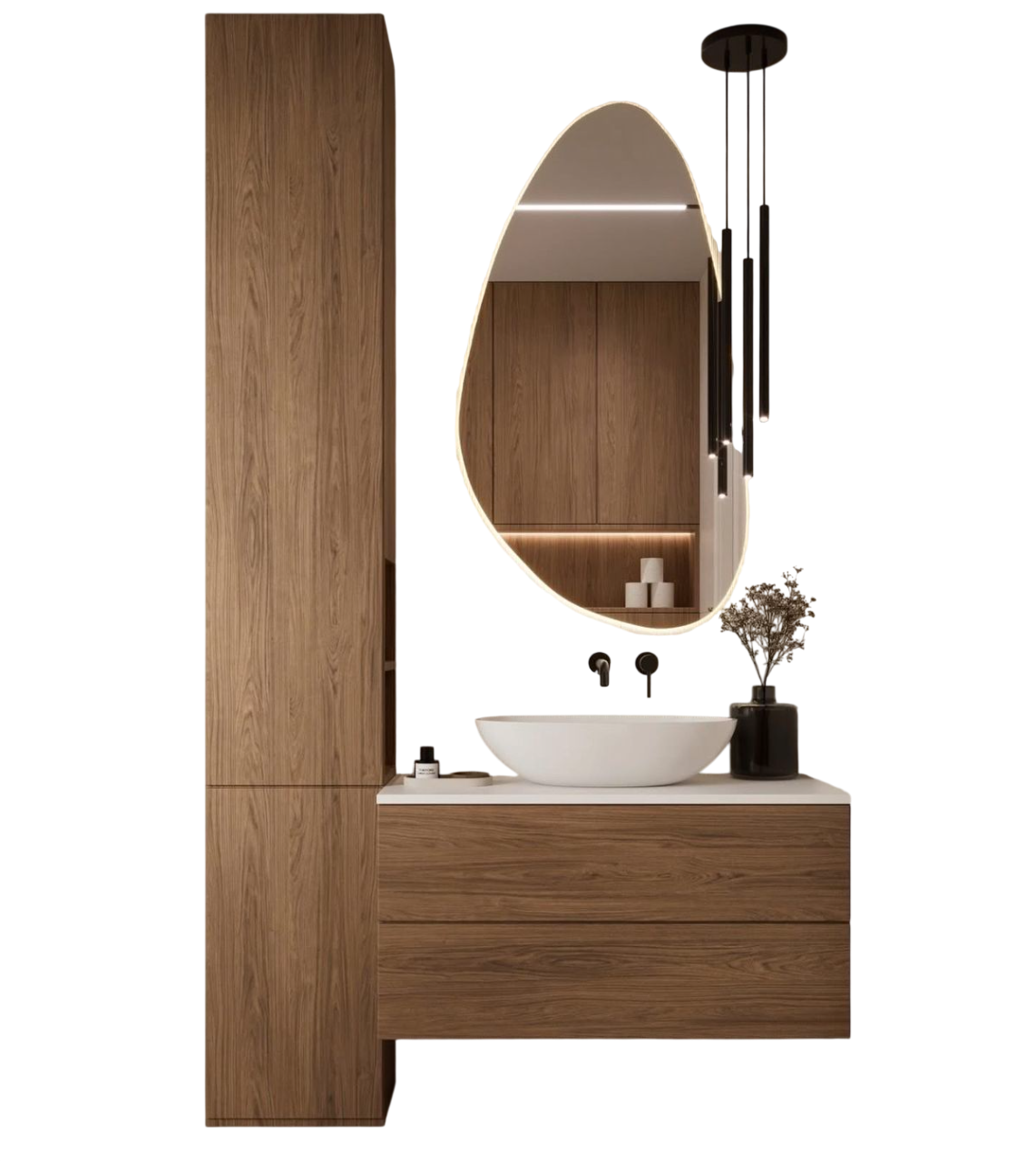 - Пеналы для ванной: Вертикальные узкие шкафы — спасение для малогабаритных помещений. Они вместительны, не загромождают пространство и часто становятся стильным акцентом.