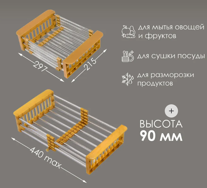 Коландеры Santegro ST17BL (графит), ST17SC (сатин) и ST17GD (золото) — это умные, функциональные и стильные вкладыши для мойки, которые превращают любую раковину в многофункциональную зону для мытья, сушки и подготовки продуктов. Благодаря телескопической конструкции, они автоматически подстраиваются под ширину чаши — от 35 до 50 см, идеально фиксируясь и не шатаются при использовании.
