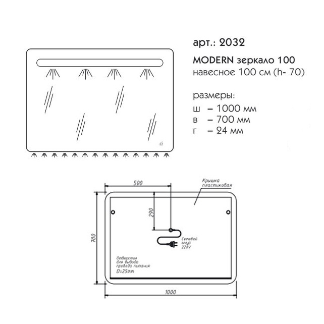 Зеркало Caprigo Modern 2032 (100x70 см). Горизонтальное зеркало для ванной. Коллекция Modern. Материал: стекло. Размеры (ШхВхТ): 100 x 70 x 2.4 см. Комплект поставки: зеркало, крепеж. Гарантия 2 года.