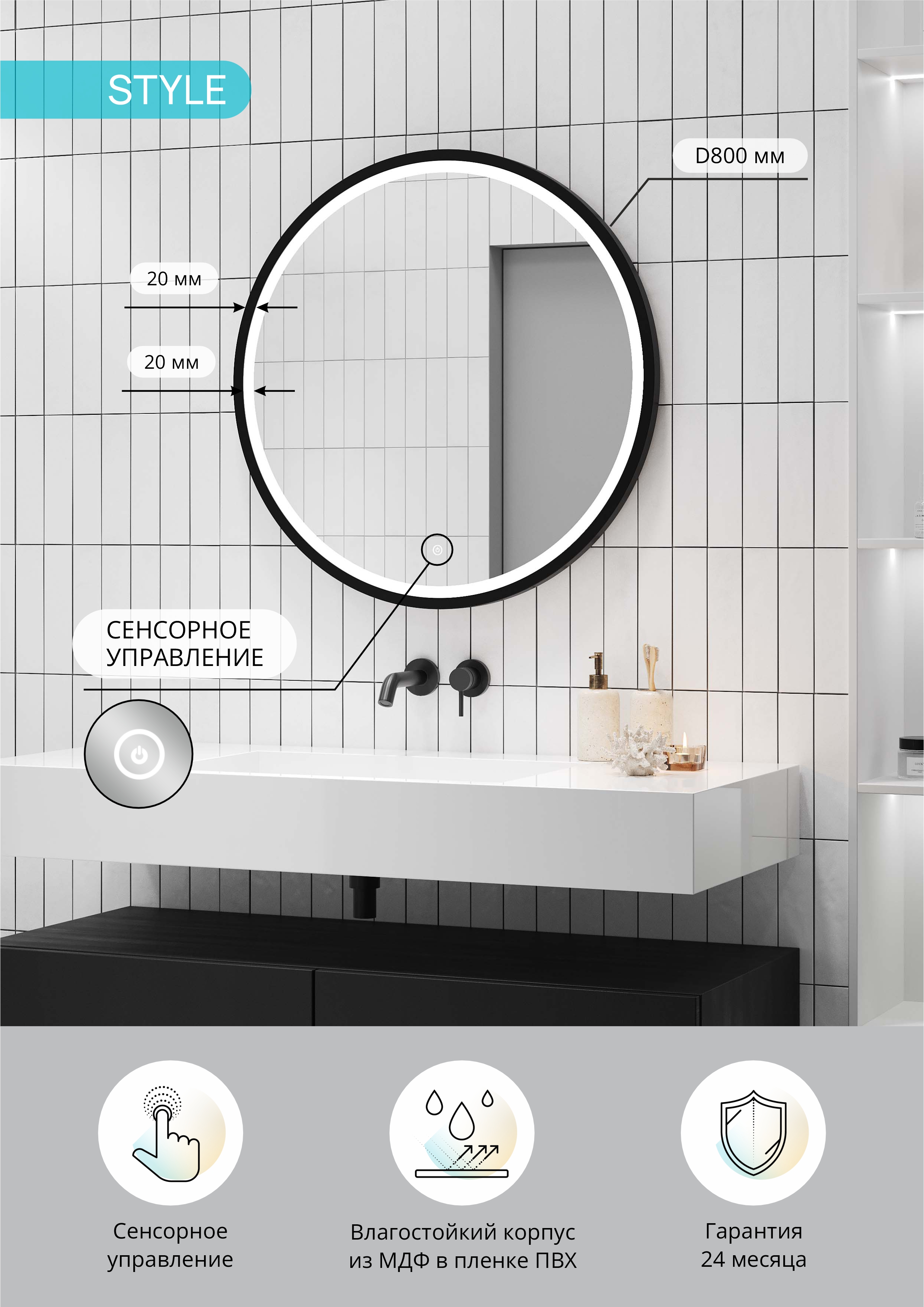 Конструктивное исполнение: Настенное (подвесное) круглое зеркало.