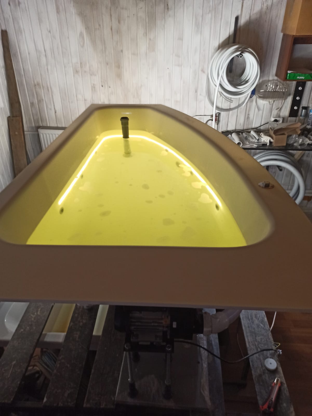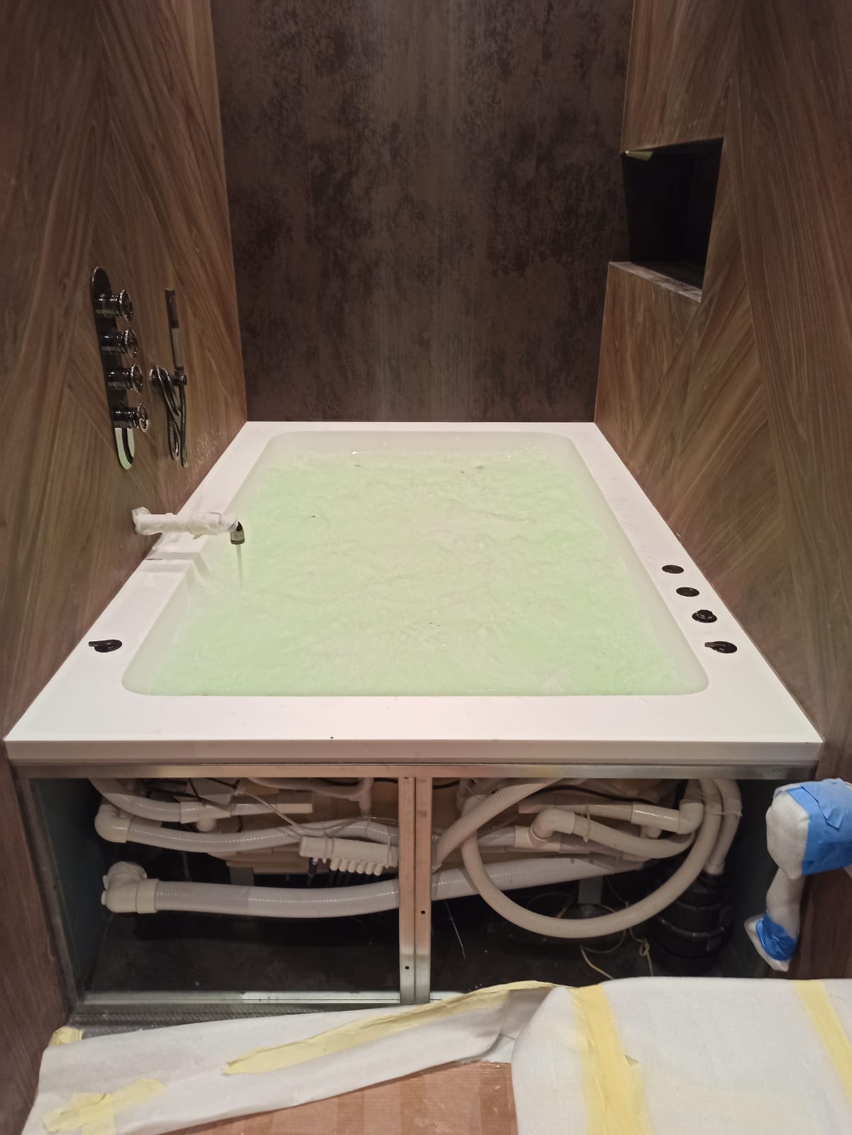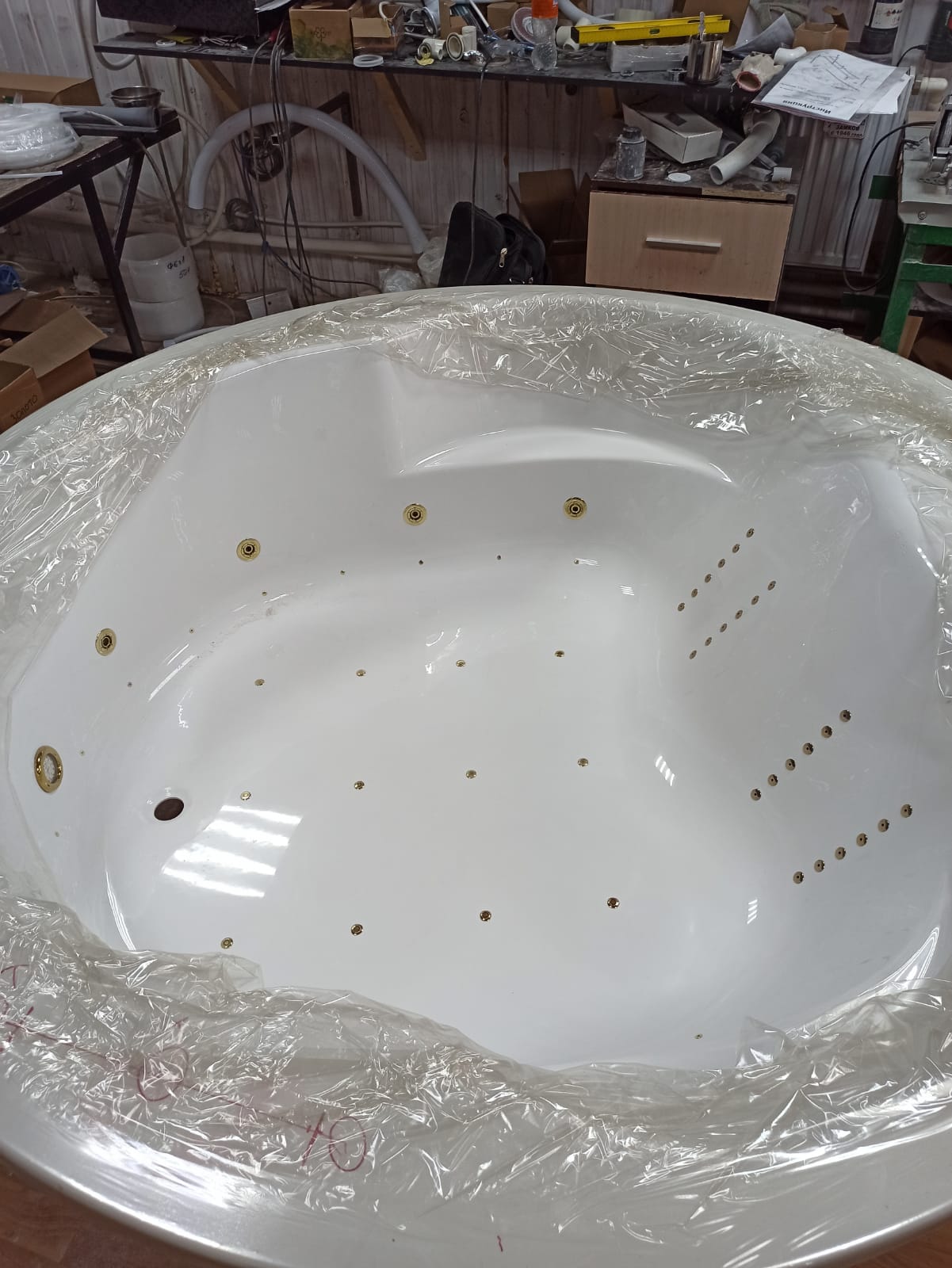 В стоимость входит монтаж и комплект оборудования для гидромассажа: насос, обвязка, 6 гидромассажных форсунок, клавиша включения/выключения. Установка гидромассажного оборудования и монтаж ванны на месте выполнялся специалистами компании САНКОРС